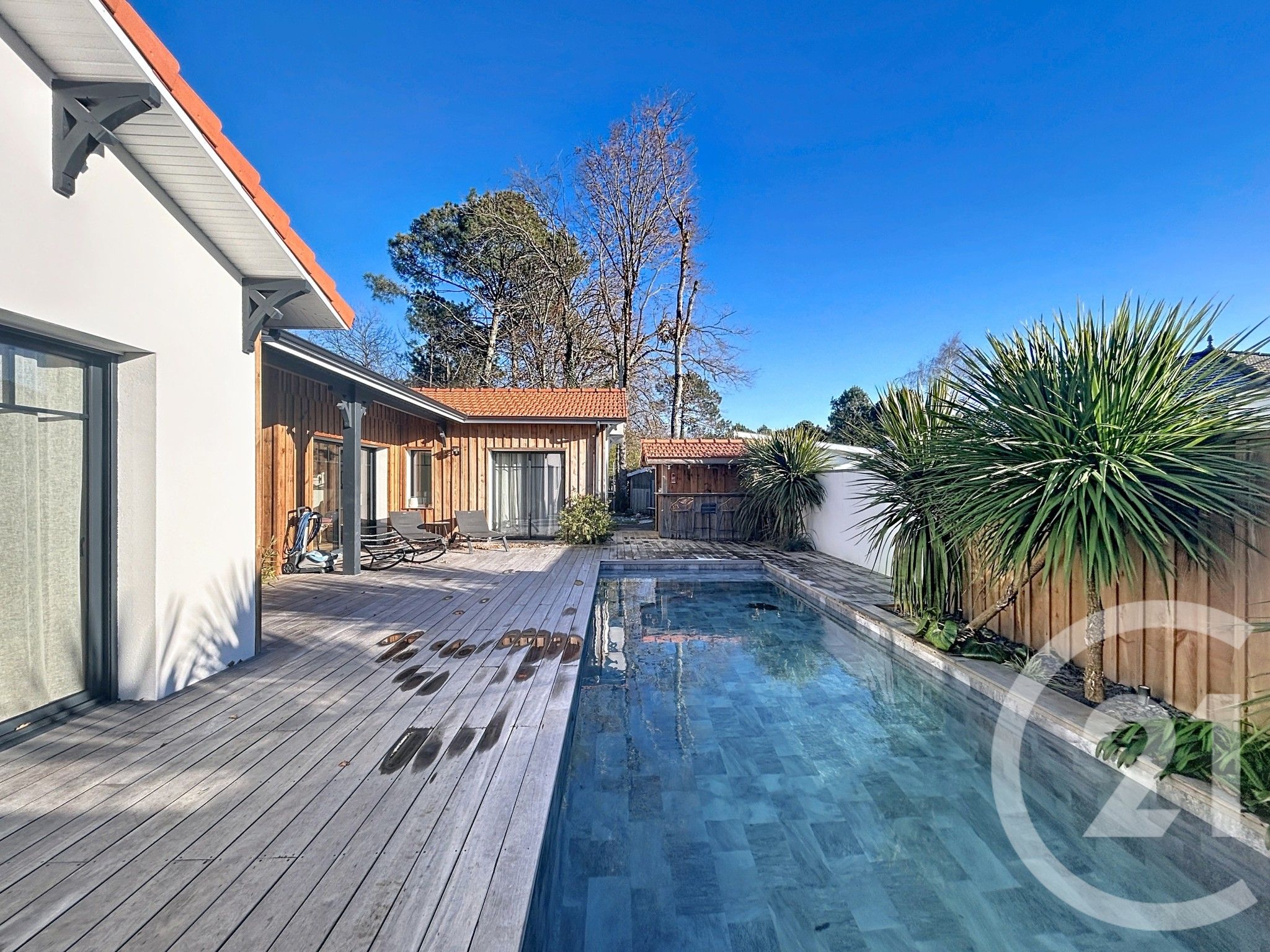 CENTURY 21 Duprat & assoviés vous présente à la vente en exclusivité à l'entrée du Teich, cette magnifique maison neuve (2023), de style néo-Arcachonnais, 160 m² habitables, plus 25 m² de garage entièrement carrelé et isolé, édifiée sur un terrain 933 m² avec piscine.